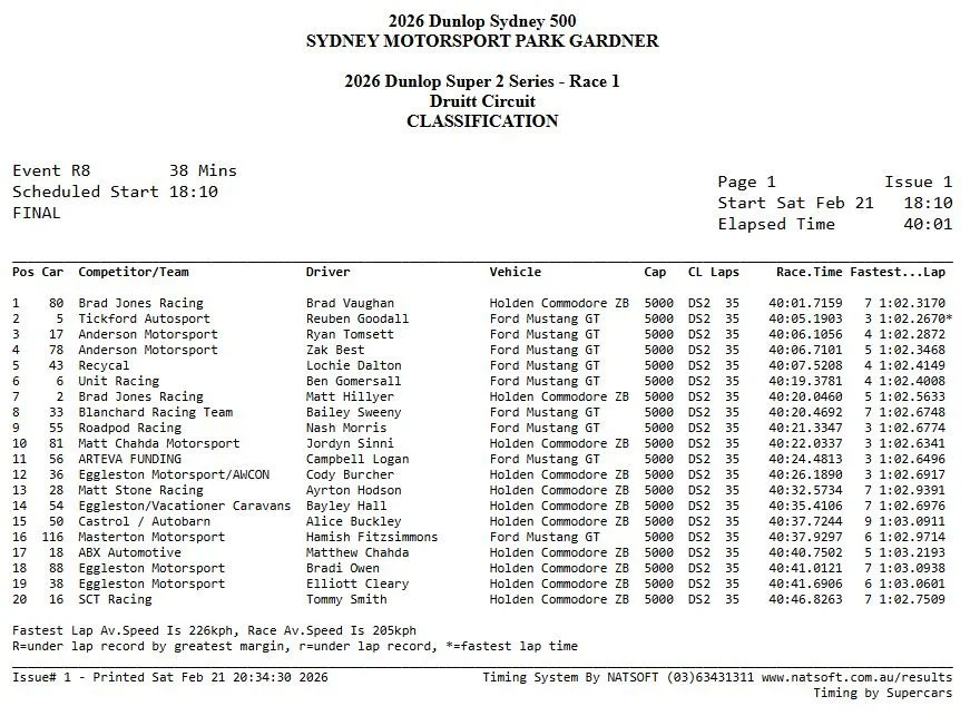 Blanchard Racing Team Super Spill and Safety Solutions Cooldrive Auto Parts driver Bailey Sweeny has come through with a solid 8th position finish from 20 cars in Race 1, during Round 1 of the 2026 Dunlop Super2 Series at Sydney Motorsport Park.