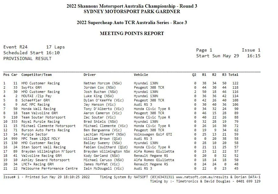 HMO Customer Racing Hyundai TCR Australia driver Bailey Sweeny has bagged 58 points towards the championship - after 3 races - during Round 4, of the Supercheap Auto TCR Australia Series, at Sydney Motorsport Park.